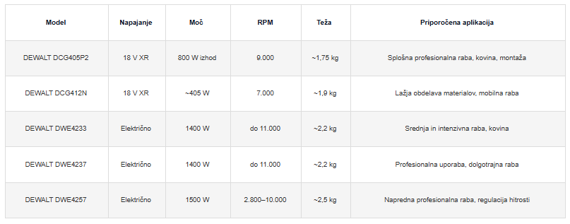 Če delo poteka na različnih lokacijah ali brez dostopa do omrežja, je akumulatorski DCG405P2 idealna izbira. Če pa gre za delavnico, kjer je omrežje stalno na voljo, električni modeli s konstantno močjo nudijo robustnost in zmogljivost brez baterijskih omejitev.