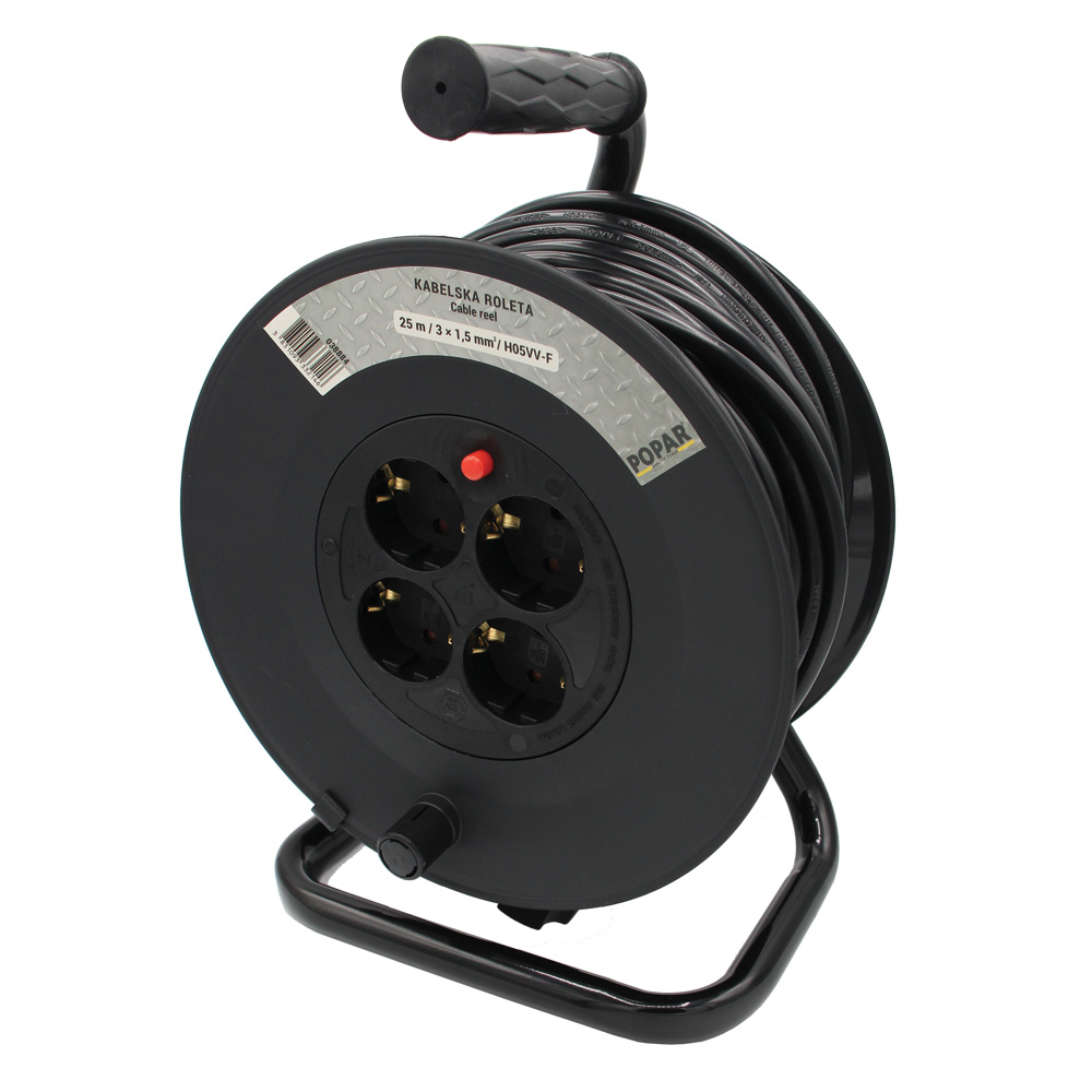 Kolut iz plastike, odporne na zlom. Stabilno,pobarvano podnožje. Ergonomski ročaj.4 vtičnice. PVC kabel 3x1,5 mm2