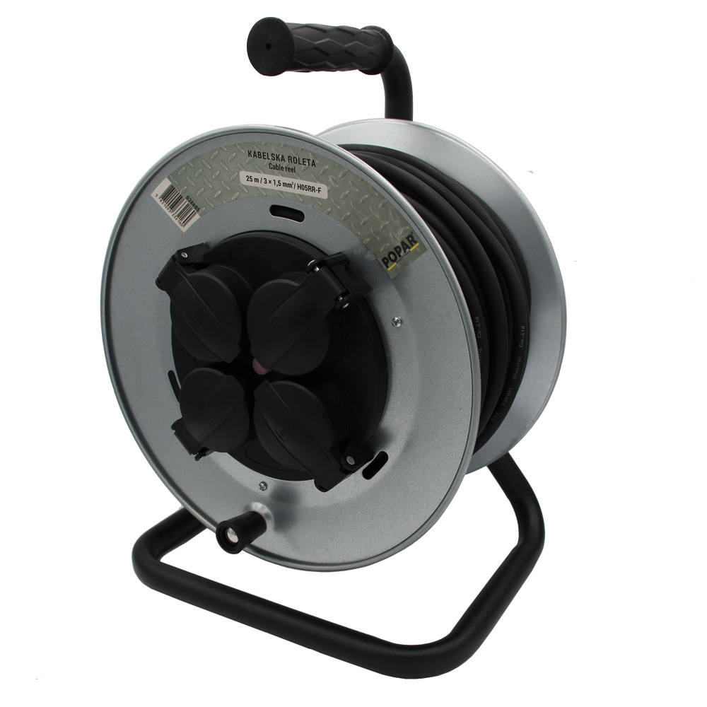 Kovinski kolut. Stabilno, pobarvano podnožje. 4 vtičnice z varnostnimi pokrovčki. PVC kabel 3x1,5 mm2. V kolutu je drsni boben, ki omogoča odvijanje brez zvijanja kabla.