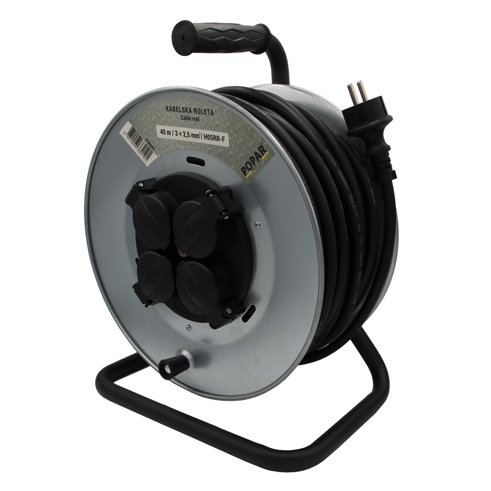 Kovinski kolut. Stabilno, pobarvano podnožje. 4 vtičnice z varnostnimi pokrovčki. PVC kabel 3x2,5 mm2. V kolutu je drsni boben, ki omogoča odvijanje brez zvijanja kabla.